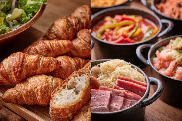 バターが香るクロワッサンや、瑞々しくフレッシュなフルーツなど、約50種類の料理をライブ感あるオープンキッチンから出来立てをご用意いたします。お好きなものをお好きなだけお召し上がりください。