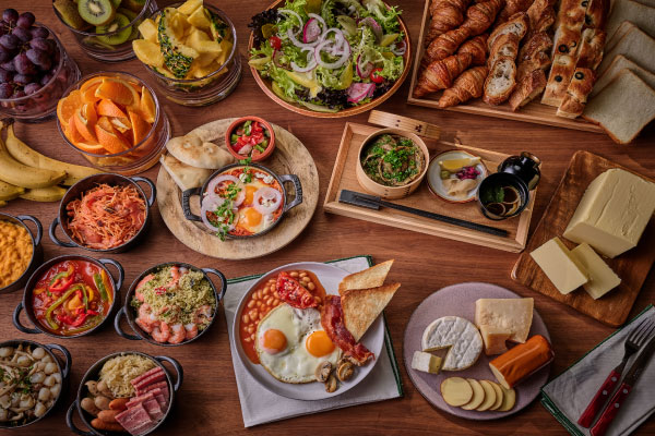 6か国の多彩な料理を取り揃えた約50種類のビュフェをご用意。車両基地を眺めながら世界を旅するような朝のひとときをお楽しみいただけます。